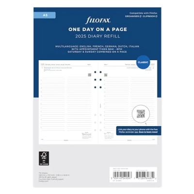 AmazonFilofax A5 2025 diary refill Day per page format Paper size 148mm x 210mm Download the free Filofax Reminder App Use the QR codes to review your diary on your phone