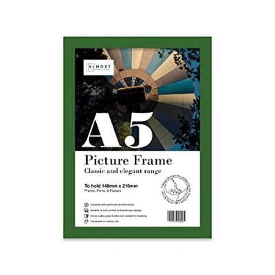 A5 Picture frame to house an A5 sized print - No mount The picture frame moulding is 20mm wide and 16mm deep External frame dimensions are: 18 x 24.5 cm - 7 x 9.6 inchs Comes with a kick-stand to display your artwork either vertically and horizontally. Fold-out wall hooks for horizontal and vertical wall hanging. Stylish thin Green picture frame for an A5 print, poster, or photo