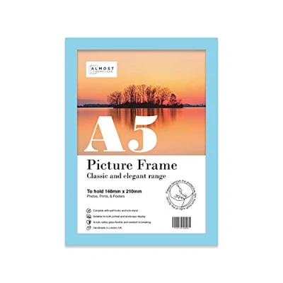 A5 Picture frame to house an A5 sized print - No mount The picture frame moulding is 20mm wide and 16mm deep External frame dimensions are: 18 x 24.5 cm - 7 x 9.6 inchs Comes with a kick-stand to display your artwork either vertically and horizontally. Fold-out wall hooks for horizontal and vertical wall hanging. Stylish thin Light Blue picture frame for an A5 print, poster, or photo