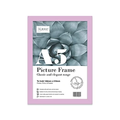 A5 Picture frame to house an A5 sized print - No mount The picture frame moulding is 20mm wide and 16mm deep External frame dimensions are: 18 x 24.5 cm - 7 x 9.6 inchs Comes with a kick-stand to display your artwork either vertically and horizontally. Fold-out wall hooks for horizontal and vertical wall hanging. Stylish thin Lilach picture frame for an A5 print, poster, or photo