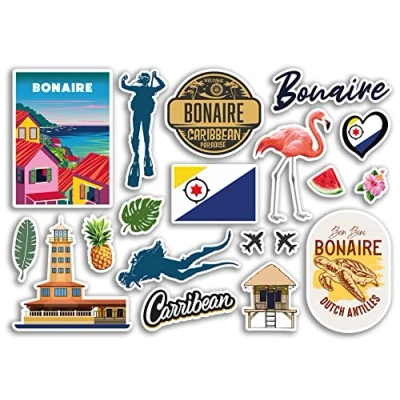 A5 Sticker Sheet Bonaire Landmarks Vinyl Stickers Caribbean Beach Scuba Diving Summer Tropical Coast Flamingo Airport Stamps Skyline Flag Map Travel Holiday Scrapbooking Luggage #79210