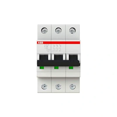 ABB S203M C50 Miniature Circuit Breaker, 3 Pole, Type C, 10kA/15kA Breaking Capacity, 50 Amp Current (2CDS273001R0504)