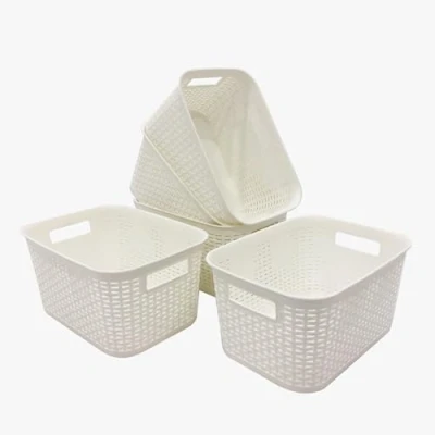 Stylish rattan design fits into any spot of your home Stackable when not in use, save space User friendly handle allows you to move the basket around easily and also aid easy access to slide the baskets when stored on shelves or in cupboards This Sturdy and Durable Basket can store everything from books & magazines, clothes, bathroom toiletries, toys to fruits and vegetables and more. Each box is approximately 7.0L Contents: 5 Pack Storage Boxes