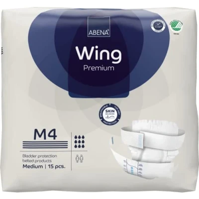 ABENA Wing is our Premium range of belted products for moderate to heavy incontinence The soft nonwoven belt, mounted through the backside of the product, is a good fixation solution for all body shapes With the extra belt length you do not need a separate extension belt High performance core with Top-Dry Technology ensures skin integrity and optimal skin care by keeping the exposed area comfortable and dry even after multiple voids The combination of leakage barriers (lengthwise and cross barriers) and elastics offer 360 degree leakage protection around the product Helps protect the skin and maintain a natural pH skin balance, with an added odour control system that minimises unpleasant smells Accredited by the Nordic Swan Ecolabel