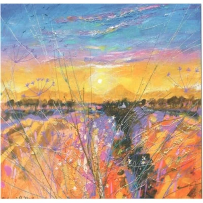 ARTWORK: Beautiful Scottish landscape greeting card featuring a vibrant harvest sunset scene in Aberdeenshire with colorful wildflowers and golden skies ARTIST: Original artwork by renowned Scottish artist Deborah Phillips, capturing the essence of Scotland's natural beauty DIMENSIONS: Square format card measuring 15 x 15 centimeters, perfect for framing or sending as a special greeting DESIGN ELEMENTS: Stunning blend of purple, orange, and yellow hues with delicate flower silhouettes against a dramatic sunset backdrop STYLE: Contemporary impressionistic interpretation of rural Scottish countryside, showcasing local landscape and seasonal colors