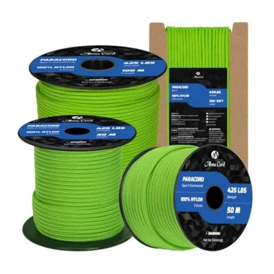 TYPE II PARACORD 425: The 3mm paracord is made of high-strength nylon, which has 3 inner strands, wrapped with an abrasion resistant 16 strand braided sheath. And each inner strand is made of 3 twisted yarns. It can withstand a load of 192kg (425lbs), combining lightweight and toughness, making cord a reliable safety equipment for extreme environments such as outdoor operations, emergency rescue. EXCELLENT DURABILITY: The parachute cord has excellent tensile strength, abrasion and corrosion resistance, and can be used reliably in a variety of harsh environments such as outdoors, in humid conditions and under high loads. It is not easy to wear, age or break. These characteristics extend the life of the utility rope, providing users with a more economical and reliable high-performance solution in the long run. HIGH PERFORMANCE: The paracord boasts excellent UV resistance, mildew resistance, corrosion resistance, and colorfastness, as well as resistance to common chemicals. These properties make it resistant to fading in complex outdoor environments such as sun exposure and rain, effectively preventing rope aging and strength loss, and ensuring consistent performance over time. 3MM x 30M SPOOL: Available in 40+ colors and multiple lengths, it can meet diverse needs from professional tasks to personal preferences. Meanwhile, the spool design of this 30m rope makes it very convenient to use, store, and carry. Users can easily cut it to any length as needed, flexibly adapting to various usage scenarios and achieving a high degree of unity between personalization and practicality. MULTI-PURPOSE ROPE: The tactical cord is suitable for bundling, fixing objects, DIY crafts such as bracelets, pet collars, belts, key chains, tool packaging, etc. In addition, it is also widely used in outdoor, camping and survival, because of its high strength and good abrasion resistance. Cord combines everyday practicality with professional needs, making it a reliable multi-functional piece of equipment. NOT FOR CLIMBING!