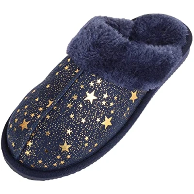 ABSOLUTE FOOTWEAR Childrens Kids Girls Slip On Open Back Faux Fur Mule Slippers with Star Design Navy UK 5 / EU 38