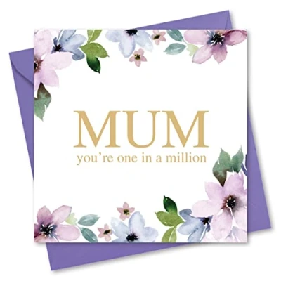MOTHERS DAY CARDS FOR MUM - 150x150mm when folded. Card supplied folded and individually wrapped with envelope. MADE IN THE UK – Designed, printed and packed in the UK, our cards are made from board which is manufactured in Europe. Cards have "Happy Mother's Day" message on inside. POSTAGE - Each card and envelope weight 22g. Size: 155x155x3mm (UK Postage - Letter) PREMIUM QUALITY THICK CARD – 365 Microns sturdy card with luxury feel. Supplied with premium quality envelopes. COMPOSTABLE BAG - Supplied in protective Biodegradable and Compostable clear bag. Made with minimum 80% renewable bio-based content.