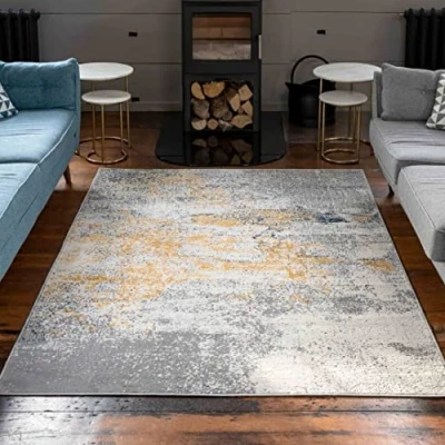 Abstract Painterly Navy Ochre Yellow Silver Grey Living Room Carpet Rug Affordable Modern Bedroom Hallway Area Rugs 120cm x 170cm