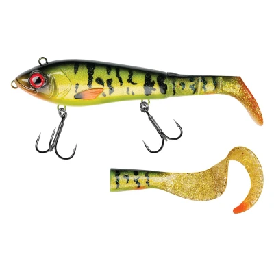 Abu Garcia Svartzonker McHybrid 20cm - Unique hybrid bait - Length: 20cm - Weight: 100g - Dive depth: 0.5-2m - Made of robust ABS - Nature friendly material - Lead-free - Stainless steel frame for extra sturdiness - Large tail screw - Attractive colours - Challenging swimming movement - Interchangeable tail - Adapt your bait to the circumstances - Strong split rings - Razor-sharp treble hooks - Designed in Sweden - Ideal for large pike The McHybrid is an effective and unique hybridbait where two worlds come together: that of a hardbait and a softbait. The first lipless crankbait with a soft paddle tail. With its broad and oval body it looks just like a real baitfish with a typical, elegant swimming pattern that attracts big predators. Attach it to the upper eye and the McHybrid will swim deeper, with a wider swimming pattern. The lower eye gives him a calmer and shallower action. If you want to create an even quieter and super shallower presentation, switch from the paddle tail to the curly tail. Available in several attractive colours.