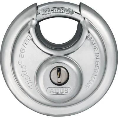 General description This ABUS 26/80 Diskus® Padlock is designed for high security, making it ideal for securing valuables or goods at a high risk of theft, such as warehouses, factory gates, containers, and lorries. It features a heavy-duty stainless steel body and is made in Germany. Technical specifications ABUS Security Level: 8 Keyed Alike Key Reference: RR00131 Shackle Width: 25mm Shackle Height: 18mm Shackle Diameter: 11mm Overall Width: 81mm Overall Height: 81mm Overall Depth: 31mm Usage Ideal for securing valuables and goods of great value Suitable for use in severe weather conditions Other information Supplied with 2 keys Key operated, lock retains key until locked Features anti-pick mushroom pins and a solid lock body resistant to drill, pull, and manipulation attacks Through-hardened steel alloy shackle resists saw attacks Anti-cut plate provides 360-degree protection from sawing Top quality welded seam secures against impact attacks