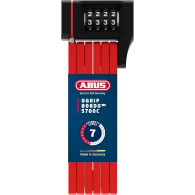 ABUS SECURITY LEVEL 7: The fashionable combination lock with 5 mm thick bars offers protection for low to medium theft risk; the 2-component number rollers ensure permanent legibility of the digits INDIVIDUALLY ADAPTABLE: This model is available in numerous colour variants for the lock body and can therefore be visually adapted to the helmet or bike, for example - individually adjustable numerical code FOLDABLE AND COMPACT: The special rivets allow flexible folding of the lock to a handy size of max. 6.7 cm x 3.5 cm x 17.8 cm and thus easy and space-saving transport RELIABLE LOCK FOR BICYCLE: Bordo uGrip 5700C80 - length 80 cm, weight 848 g without holder, ABUS security level 7, holder included in the scope of delivery INCL. SH 5700 HOLDER: tool-free installation thanks to practical tensioning straps - lock can be removed from the holder from the front