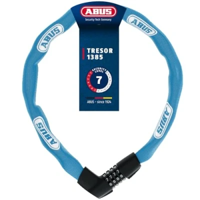 Trendy combination lock with ABUS security level 7: With this model, ABUS offers a simple, modern bike lock for good protection against a medium risk of theft Robust steel chain for good resistance: The high-quality 7 mm square chain is made of specially hardened steel and is encased in a textile tube to protect against damage to the paintwork Simple locking with numerical code: Thanks to 2-component number rollers, the digits are permanently easy to read - with special scanning protection against tampering with the lock Bicycle lock for high-quality bicycles: Tresor 138585 - length 85 cm, weight 1050 g, ABUS security level 7, colour blue Secure, reliable and stable. This is what the name ABUS stands for. Whether it's home protection, property security or mobile security: ABUS sets the standards''