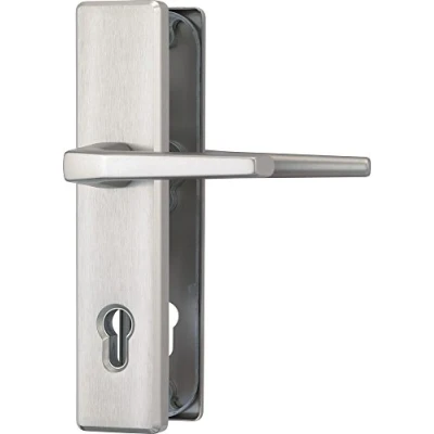 Standard door security fitting for house entrance doors pusher (latch) on both sides Increased tear-off protection due to stable cams and internal screw connections Distance 92 mm (52-67 mm), square spindle 10 mm. Colour stainless steel look, Manufacturer: Abus