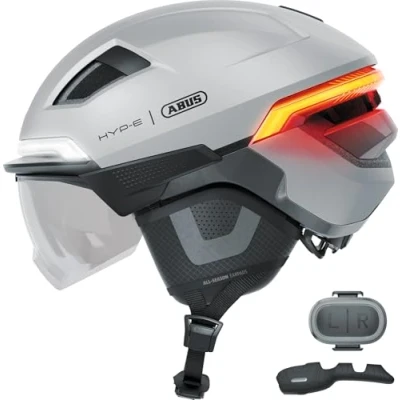 ABUS HYP e B.LACE Bike Helmet with Front, Rear and Indicator Light as well Wireless Brake Activation Visor Earmuffs for Bike, S Pedelec Size M, Silver