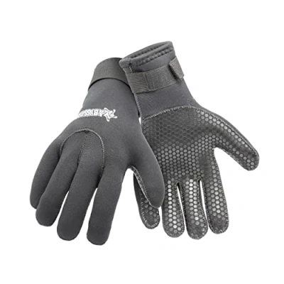 Pair of 5 mm Neoprene Gloves Interior lined with soft plush and black nylon lined outer Non-slip palm and Velcro adjustment strap