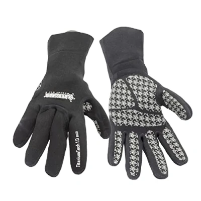 Pair of technical gloves made of super thin neoprene 1 mm outer coated in black nylon and internally splamed titanium Watertight taped joints for better thermal and reinforced non-slip palm