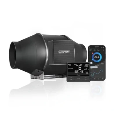 Designed to ventilate hydroponic grow rooms, transfer heating/cooling, cool AV closets, and exhaust odors. Dynamic temperature and humidity programming, with timers, grow cycles, scheduling, minimum speed. Connect with our app via Bluetooth to access advance programs, alarms, notifications, and view climate data. Mixed flow design combined with a PWM-controlled EC-motor for a truly quiet and energy efficient performance. Duct Size: 4” | Dimensions: 6.9 x 11.9 x 7.4 in. | Airflow: 205 CFM | Noise: 28 dBA | Bearings: Dual Ball This product is equipped with a Type-G power plug and is compatible with the voltage commonly used in the United Kingdom., Weight: 6.25E-4 Pounds, Manufacturer: AC Infinity