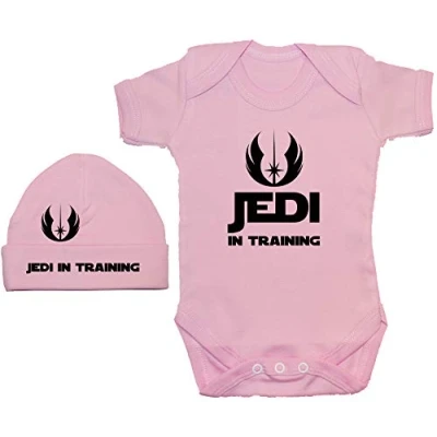 Acce Products Jedi in Training Baby Grow/Bodysuit/Romper/T Shirt & Beanie Hat/Cap 3 6 Months Pink