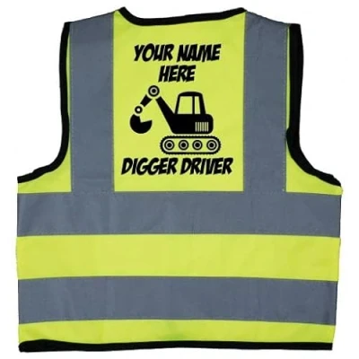 Acce Products Personalised Digger Driver Baby, Toddler, Children, Kids Hi Vis Safety Jacket Vest Size 4 6 Years Yellow Optional On Front