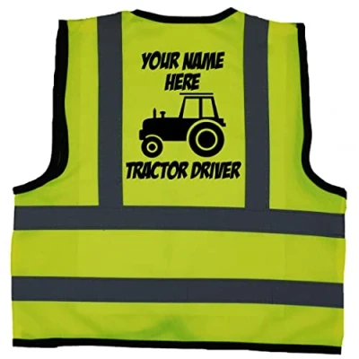 Acce Products Personalised Tractor Driver Baby, Toddler, Children, Kids Hi Vis Safety Jacket Vest Size 1 2 Years Yellow Optional Text On Front