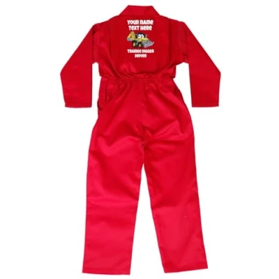 Acce Products Personalised Trainee Digger Driver Coloured Excavator Baby, Toddler, Childrens, Kids, Coverall, Boilersuit, Overall Size 26, 5 6 Years Red Optional Text to Front
