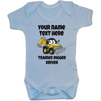 Acce Products Trainee Digger Driver Personalised Name Colour Pic Baby Grow, Bodysuit, Romper, T Shirt 3 6 Months Blue