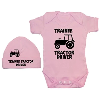 Acce Products Trainee Tractor Driver Baby Bodysuit/Romper & Beanie Hat 3 6 Months Pink