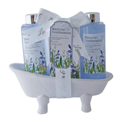 Pamper set: the lavender and sage scented care products pamper the skin with plenty of moisture, making it soft and supple. All products come already in a stylish ceramic bath that can also be used as storage or decoration. Perfect gift idea: with this shower set you give wellness for your home. The fragrant products are the perfect gift for any occasion, whether for Easter, Mother's Day, Valentine's Day, birthday or Christmas Feel-good guarantee: the bath additives such as bubble bath and bath salts ensure restful bathing fun. Together with the shower gel, this completes the gift set wonderfully. Product details: the 3-piece care set contains everything you need for relaxation and well-being. 140 ml shower gel, 140 ml bubble bath and 50 g bath salt. Discover more: Experience our wide range of items in the field of personal care! Our range includes a variety of lovingly packaged sets and exceptional gift accessories for care, bathing and cosmetics