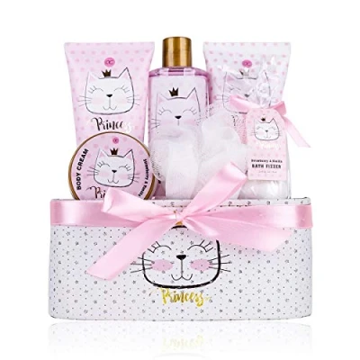 Pampering set: the care products scented with strawberry and vanilla pamper the skin with moisture, making it soft and supple. All products come in a decorative gift box, which is also perfect as storage or for dolls Perfect gift idea: surprise your girlfriend, daughter, granddaughter or niece with a shower set for real cat lovers. Whether for small or large princesses, the fragrant products are the perfect gift for every occasion Feel-good guarantee: the bath bombs together with a soft mesh sponge and a shower gel. The skin can be prepared with the peeling and then creamed with the body cream or body lotion Product details: the 7-piece care set contains everything you need for relaxation and well-being. 250 ml shower gel, 180 ml body lotion, 180 ml body scrub, 60 ml body cream, 2 x 40 g bath fizzer, 10 g mesh sponge and a practical gift box in cute kitten design with the dimensions 20.5 x 22 x 10 cm Discover more: experience our wide range of products in the field of personal care. Our range includes a variety of lovingly packaged sets and exceptional gift accessories for care, bathing and cosmetics