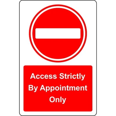 Access strictly by appointment only sign Self adhesive sticker Digitally printed and laminated for extra durability Remove backing film and apply to dry, smooth, oil free surface.