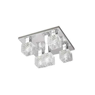 This range is a collection of three 5 light flush ceiling lights. All three lights are available in different colour finishes Polished Chrome, Satin Nickel and Antique Brass. The square ceiling plates host five clear cubic glass with a textured wave pattern. Each glass attaches to small cubic arms that pertrude vertically from the ceiling plate. The central glass fixes to a longer cubic arm adding further feature and dimension to the light fixture.