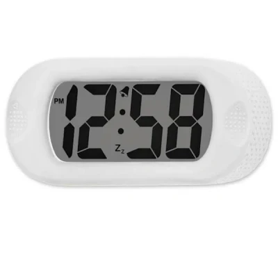 General description This Acctim Silicone White Clock features a soft silicone case and a large digital display that lights up at the touch of a button. It is designed for easy viewing at night with Smartlite® technology, which provides a bright green backlight that illuminates the display in low light conditions and turns off during the daytime to extend battery life. Technical specifications Dimensions: L5cm x W14cm x H6.9cm