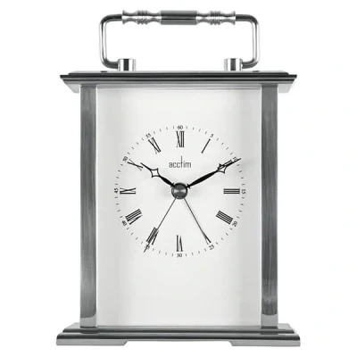 Harts of SturThe Acctim Gainsborough Mantel Clock in Silver is classic designed silver carriage clock complete with a polished metal handle and case, glass lens and energy efficient movement. Dimensions: 14.5cm x 12cm x 5cm. Acctim clocks that feature energy efficient movements are 20% more efficient than standard movements, increasing battery life significantly to save you money.