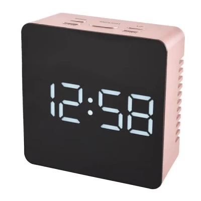 General description This Acctim Lexington Rose Gold Clock features a sleek design with a LED display and a mirror lens, allowing for adjustable brightness to suit your preference. It is both battery and USB powered, providing flexibility in how you choose to use it. Technical specifications Dimensions: L3.9cm x W8.2cm x H8.2cm Power source: Battery or USB (lead supplied) Features: Crescendo alarm with snooze function, indoor temperature display