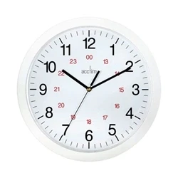 EurofficeWall clock with red 24 hour display. White plastic case with numbered white dial. Plastic lens protects clock face. With precision quartz clock movement. Face diameter: 300mm. Requires 1x AA battery (included). Colour: White.