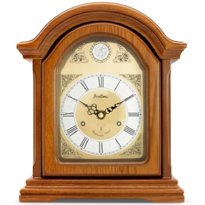 ManoManoAcctim Redbridge Dark Wood Clock's arched wooden mahogany-effect cabinet proudly displays a spun metal dial with Roman numerals, decorative hands and raised spandrels. The Westminster chime, fashioned after the tune at the Palace of Westminster, strikes hourly, with automatic night shut-off, and the energy efficient movement and radio controlled technology keeps perfect time.