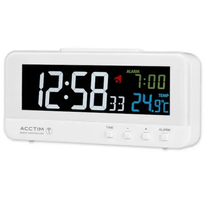 This high contrast Acctim Rialto White Clock, boasts a full VA display and adjustable brightness for the ultimate viewing clarity.The multifunction display shows the time, alarm and snooze, and indoor temperature, whilst the radio controlled technology ensures you always have the exact time.Rialto is your ultimate timekeeper, even employing a battery backup to the mains power in case of any power cuts.Dimensions: L3.4 cm x W14cm x H7cm.