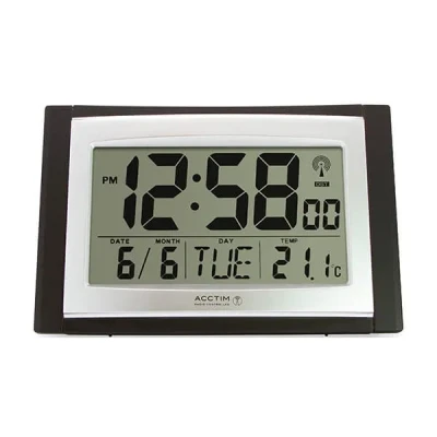 This radio controlled LED Acctim Stratus Black Wall Clock offers automatic setup, date display and indoor temperature, making it a practical addition to any room.Enjoy peace of mind with a clock that keeps perfect time automatically and clearly displays the date, day and temperature. Its versatile design suits both wall and tabletop use, helping you stay organised wherever you need it.The LCD display is easy to read, showing calendar details alongside the time. Features include an alarm with snooze function and flexible mounting options for wall or desk placement.
