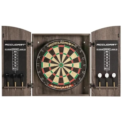OFFICIAL SIZE - 18" x 1.5" ideal dartboard cabinet set for recreational and local competitive steel tip play SELF-HEALING SISAL - Made with genuine bristle sisal that repairs itself after darts are removed from the board WALL-MOUNT CABINET SET - Grey wood finish cabinet featuring dart storage, and two chalkboards with chalk and eraser ROUND SPIDER WIRES - Allows darts to glide off the wire into the board, reducing bounce outs. ROTATABLE METAL NUMBER RING - Prolongs the life of the dartboard