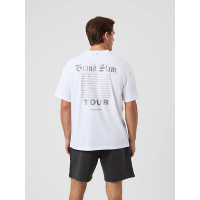 The Björn Borg Ace Oversized T-Shirt for men is made from a soft blend of cotton and recycled polyester quality fabric with a snow-wash effect for a vintage look. It has a loose, oversized fit, a round neck, and a tennis-inspired logo print on the front and tour print on the back. * Recycled material * Vintage snow-washed fabric * Loose oversized fit * Round neck * Tennis-inspired logo print