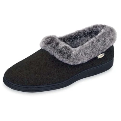 Classic design- All-season house shoe with slip-on closed back design. Luxuriously soft plush faux wool with fuzzy faux chinchilla trim and lining. Skid-resistant, weatherproof rugged durable rubber sole provides indoor & outdoor versatility. Slip on comfort- Closed toe style with comfortable and breathable support that surrounds your feet and toes in cloud like comfort; Marshmallow-like cushion for tired toes and heels, helps reduce muscle fatigue and relieves pain and pressure. Memory foam + arch support- Flexible Cloud Contour multilayer insole with memory foam foot bed for heel and arch support that cradles the contour of your foot. Versatile and stylish- Casual every day, multi-use slipper with slip-resistant, durable and lightweight sole allows you to pamper your feet with every step, from house and bedroom to spa and travel. Sizing and care- Small (5-6), Medium (6.5-7.5), Large (8-9), X-Large (9.5-10.5), XX-Large (11-12). Available in wide sizes in Black, Crackleberry and Stone. Easy care: Machine wash and air dry.