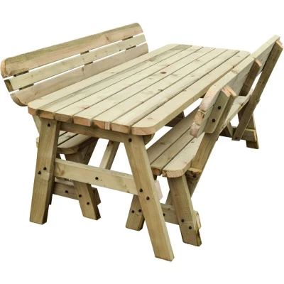 ManoManoGeneral description At Arbor Garden Solutions, we champion wooden outdoor furniture as an affordable and sustainable way to enhance your outdoor space. Our 8ft (240cm) picnic table and bench set features a natural light-green finish, designed for both relaxation and functionality. Each bench is supplied in knockdown form for easy on-site assembly, allowing for convenient access to your desired location. Technical specifications Table Height: 730mm Table Width: 700mm Bench Height: 465mm Bench Width: 265mm Benches are 30cm shorter than the table length for easy storage Material: Heavy-duty pressure treated timber (89mm x 38mm / 4 x 2) All visible bolts have black cover caps for safety and aesthetics Corrosion-resistant fixings Available finishes: Rustic brown and light green (natural) Timber sourced from responsibly managed forests Installation Easy to assemble, the picnic table set requires only a socket set and screwdriver (preferably battery-operated). Assembly instructions will be