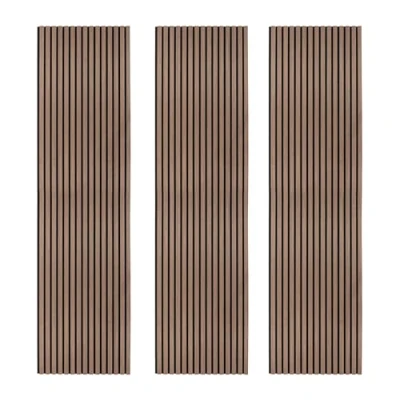 ManoManoGeneral description Redefine your space with these striking dark walnut wood effect acoustic slatted wall panels, seamlessly blending sophisticated style with impressive sound absorption for a truly transformative aesthetic. Perfect for homes, offices, or creative studios, these panels effortlessly elevate interiors while improving acoustic performance. Whether you're creating a feature wall or enhancing the ambience of a room, these panels strike the ideal balance between form and function. Technical specifications Colour: Dark Walnut Weight: 33kg Slat Material: MDF & Wood Veneer Backing Material: 9mm Thick Felt Height: 2400mm / 240cm / 94.5” Width Per Panel: 600mm / 60cm / 23.6” Total Width: 1800mm / 180cm / 70.9” Depth: 21mm / 2.1cm / 0.8” Slat Dimensions: 27mm W x 12mm D Space Between Slats: 13mm Installation Installing these panels is straightforward thanks to the included fixing kit. They are designed to mount directly onto walls or ceilings, offering versatility for a wide