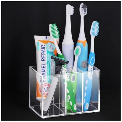 Clear Toothbrush Holder Capacity: Organize your bathroom accessories with ease using this acrylic toothbrush holder. It features 4 small slots and 1 large slot, providing space for 4 electric toothbrushes and 2 toothpaste tubes. 4 small slots can hold both regular toothbrushes and electric toothbrushes, while the large slot can store razors, facial cleansers, combs, and more. Premium Material: Crafted from high-quality acrylic, this toothbrush holder is built to last and resistant to rust, ensuring long-lasting use in the bathroom. It is also effortless to maintain - simply wipe it with a damp cloth or rinse with water. Regular cleaning helps prevent the buildup of stains. Anti-slip Design: A non-slip silicone pad is added to the bottom of the toothbrush holders, so you can put it anywhere. Without worrying about your toothbrush and toothpaste falling out. Multi-purpose Organizer: This versatile toothbrush holder is not limited to toothbrushes alone. It can also neatly store electric toothbrushes, makeup brushes, razors, combs, and various other bathroom accessories, helping keep your countertop clean and clutter-free. Better Quality: We prioritize quality and ensure that this toothbrush holder is made to last. Its sturdy construction and premium materials make it a reliable choice for your bathroom organization needs.