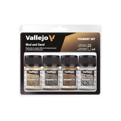 Achieve realistic mud and sand effects in your models and dioramas with this SET OF PIGMENTS, featuring 4 jars of 35 ml each with safety closures. Includes a step-by-step tutorial by Chema Cabrero for easy application. Colors included: 73.102 Light Yellow Ocher, 73.104 Light Sienna, 73.109 Natural Shadow, and 73.113 Light Slate. Made in Spain, backed by warranty Unleash your creativity with the Barro y Arena Pigment Set, designed to inspire every project. Featuring high-quality synthetic pigments known for their lightfastness and permanence, this set captures the unique essence of any environment. Perfect for adding authenticity to your models, these pigments provide the versatility and precision needed for realistic, detailed finishes. Made in Spain, backed by warranty Exceptional realism for model enthusiasts: The Pigment Fx range allows you to simulate operational or weathering effects on all types of vehicles. Expertly selected tones enable you to accurately represent various climatic and geographical conditions in your dioramas or models. Made in Spain, backed by warranty PIGMENT FX: Achieve realistic weathering effects on all types of vehicles with our selection of natural and synthetic pigments, chosen for their durability and lightfastness. Apply easily with a brush on dry models, using Thinner for dry mud or dust effects, or with Pigment Binder for added volume, like accumulated mud. Made in Spain, backed by warranty Inspire your creativity with ACRYLICOS VALLEJO, a leader in high-quality water-based acrylic paints for over 50 years. Our commitment to excellence ensures innovative and reliable solutions that help artists bring their visions to life with precision and historical fidelity. Made in Spain, backed by warranty