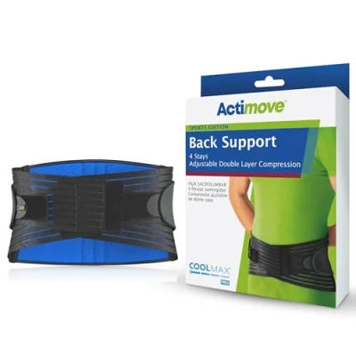 Pain relief and healing are supported through balanced warmth and compression. Helps with acute and chronic back pain, lumbar strains and muscular insufficiency Advanced support: Provides relief from back pain, with an adjustable, circumferential double-layer compression Neoprene-free performance material: Made with COOLMAX AIR technology, this back support provides comfort with exceptional breathability through the quick drying perforated performance material Flexible comfort: Comfortable to wear as the four flexible stays maintain the support position on the lower back even when sitting Actimove SPORTS EDITION Back Support, 4 Stays, Adjustable Double Layer Compression is available in five different sizes: S, M, L, XL, and XXL
