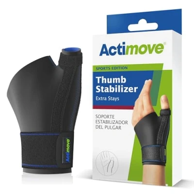 THUMB STABILISER - Our adjustable thumb sleeve offers stabilisation of thumb injuries with wrist support while allowing full finger movement and hand dexterity MEDICAL COMPRESSION - Pain relief and healing are supported through balanced warmth and medical compression with this thumb brace ADJUSTABLE - Comfortable to wear due to the premium quality soft material. This thumb and wrist support has a powerful elastic strap that provides firm and adjustable support LATEX FREE AND NEOPRENE FREE - Made with COOLMAX AIR technology and quick-drying, perforated performance material, our Actimove thumb support provides comfort and good breathability when being worn WEAR ON LEFT OR RIGHT - Our wrist and thumb brace can be worn on the left or right hand. This is a size Small to Medium and fits measurements 14cm - 19cm