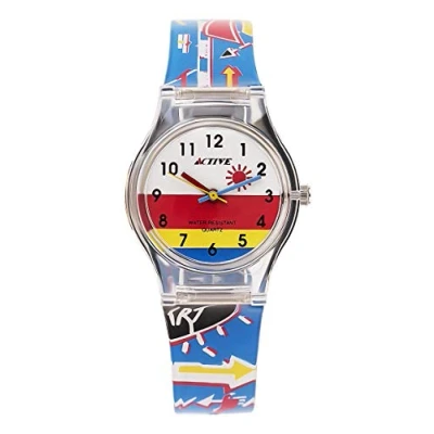 Great design: Analogue Child's watch with a quartz movement Premium quality: By using high-quality materials ✓ Glass: Plastic glass ✓ Case material: Plastic ✓ Bracelet material: Plastic ✓ Waterproof: 3 bars Compact size: ✓ Case diameter: 28 mm, ✓ Height: 10 mm, ✓ Bracelet: Length: 17 cm, Width: 16 mm. Due to this great size, the watch is absolutely for everyday use✓ Weight: 13 Gram Color: The classic Color makes the watch suitable for daily use - Case Color: Without, Dial Color: Multicolour, Bracelet Color: Multicolour Includes: A beautiful, original Active giftbox. Also Includes a manual, service card and a 2-year warranty