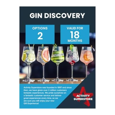 PERFECT GIFT FOR ALL GIN LOVERS: Calling all gin enthusiasts. Are you a worshipper of the of the juicy juniper berry? Does hearing the abbreviation G&T fill you with excitement? If the answer is yes, then this box is for you. 2 OPTIONS TO CHOOSE FROM: From Gin tasting to Gin afternoon teas, you are sure to have a great time & enjoy plenty of Gin! 18 MONTH VALIDITY: This experience gift voucher is valid for 18 months from the date of purchase with further extensions available. Validity Incudes free and unlimited exchanges to any of our 1,000+ experience days. 3 MILLION CUSTOMERS: Activity Superstore was founded in 1997 and since then we have given fantastic experiences to over 3 million customers! We pride ourselves on providing an outstanding customer experience. GIFTS FOR ALL OCCASSIONS: Our award-winning experience days make the perfect gift for anniversary gifts, retirement gifts, couples gifts, wedding gifts, gifts for her, gifts for him, birthday gifts, Mothers Day Gifts, Fathers Day Gifts.